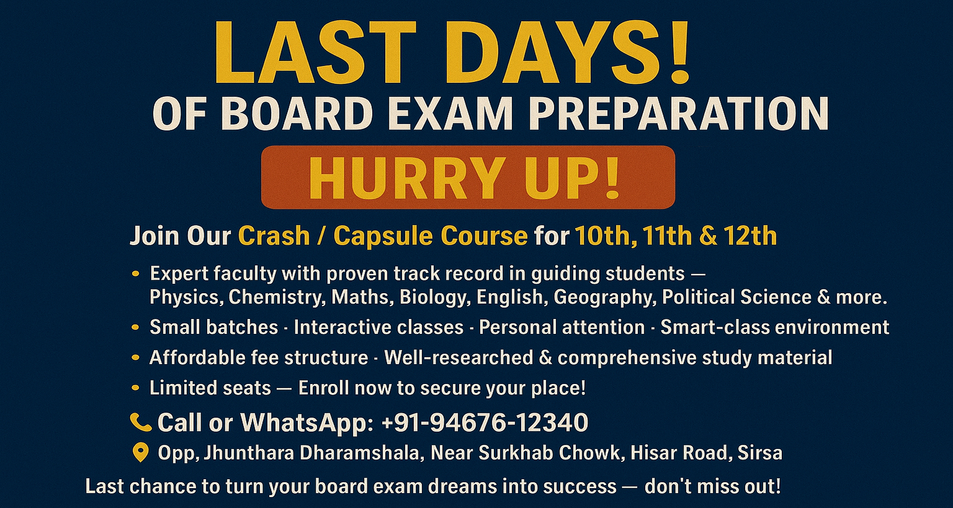 Welcome to Vartmaan Institute, the leading coaching center in Sirsa dedicated to helping students achieve their academic goals. At Vartmaan Institute, we offer specialized coaching for a wide range of subjects including Physics, Chemistry, Biology, Mathematics, English, Geography, and Political Science.